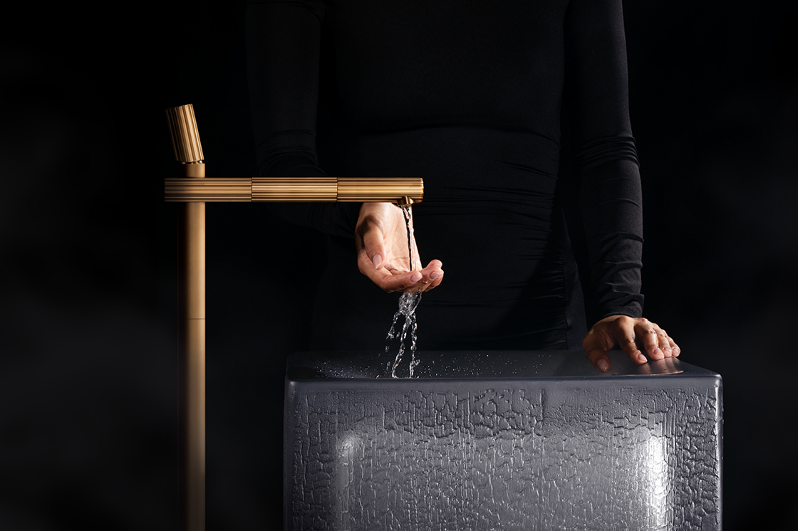 Le texture verticali, che arricchiscono corpo e leve di apertura, creano giochi di luce e profondità tattile, esaltando il contrasto tra superfici lisce e incise.