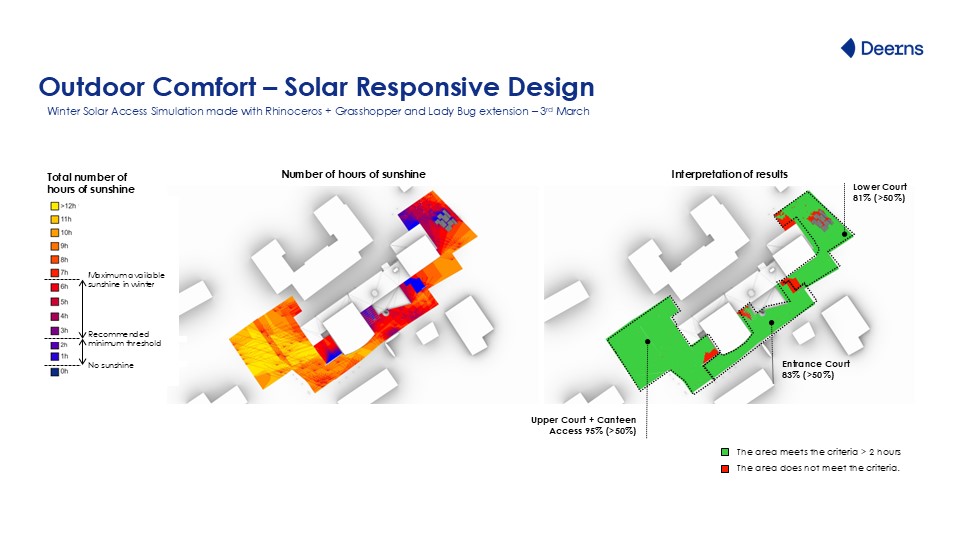 Il progetto ha garantito inoltre un corretto equilibrio stagionale tra sole e ombra, con oltre l’80% della superficie del cortile esposta al sole in inverno e l’incremento delle zone ombreggiate in estate, con la conseguente riduzione delle aree con stress termico prolungato.