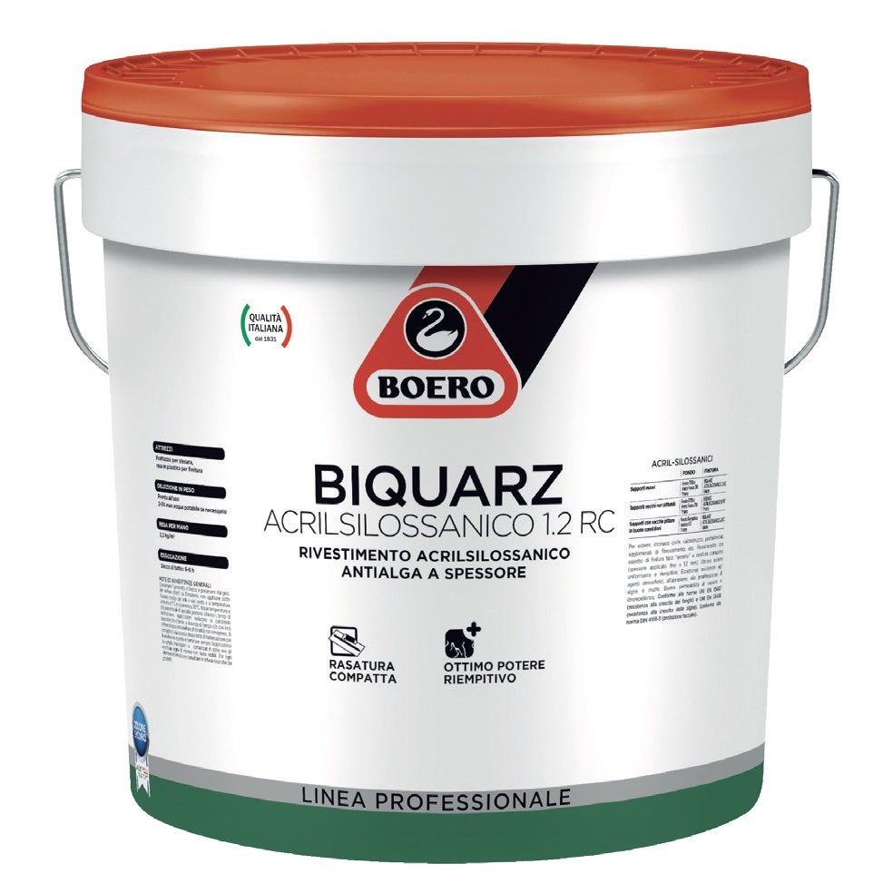 8. Finitura Biquarz Acrilsilossanico 1.2: rivestimento antialga a spessore acrilsilossanico, caratterizzato da elevata idrorepellenza e permeabilità al vapore. Granulometria 1,0-1,5 mm. Assorbimento d’acqua: W = 0,06 kg/m2h0,5 UNI EN 1062-3. Permeabilità al vapore acqueo: μ.s = Sd = 0,22m. UNI EN ISO 7783-2 – UNI EN 1062-1