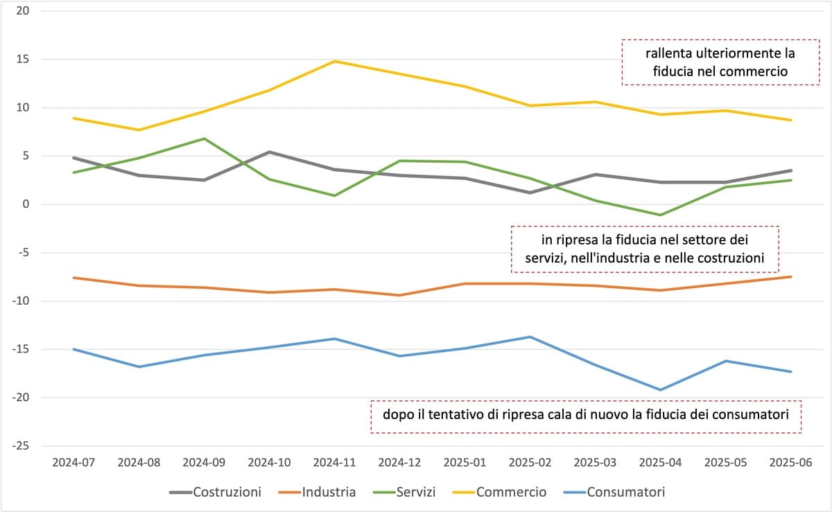 Per industria e sevizi, invece, la dinamica rilevata a giugno segue quella del settore delle costruzioni, un elemento positivo soprattutto per l’industria, che sembra aver ripreso una dinamica positiva dopo tanti mesi di flessione al ribasso, la cui dinamica andrà valutata anche in funzione delle decisioni definitive sui dazi di Trump e dell’Europa, con le valutazioni sugli impatti per le imprese che potranno avere effetti a oggi non attesi, ma certamente non positivi a prescindere dall’esito della disputa tariffaria.
