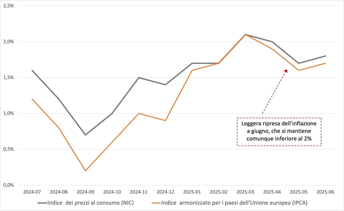 L’inflazione acquisita per il 2025 è pari a +1,4% per l’indice generale e a +1,8% per la componente di fondo. L’indice armonizzato dei prezzi al consumo (IPCA) aumenta di 0,2% su maggio e dell’1,8% rispetto a giugno 2024 (da +1,7% di maggio); la stima preliminare era +1,7%.