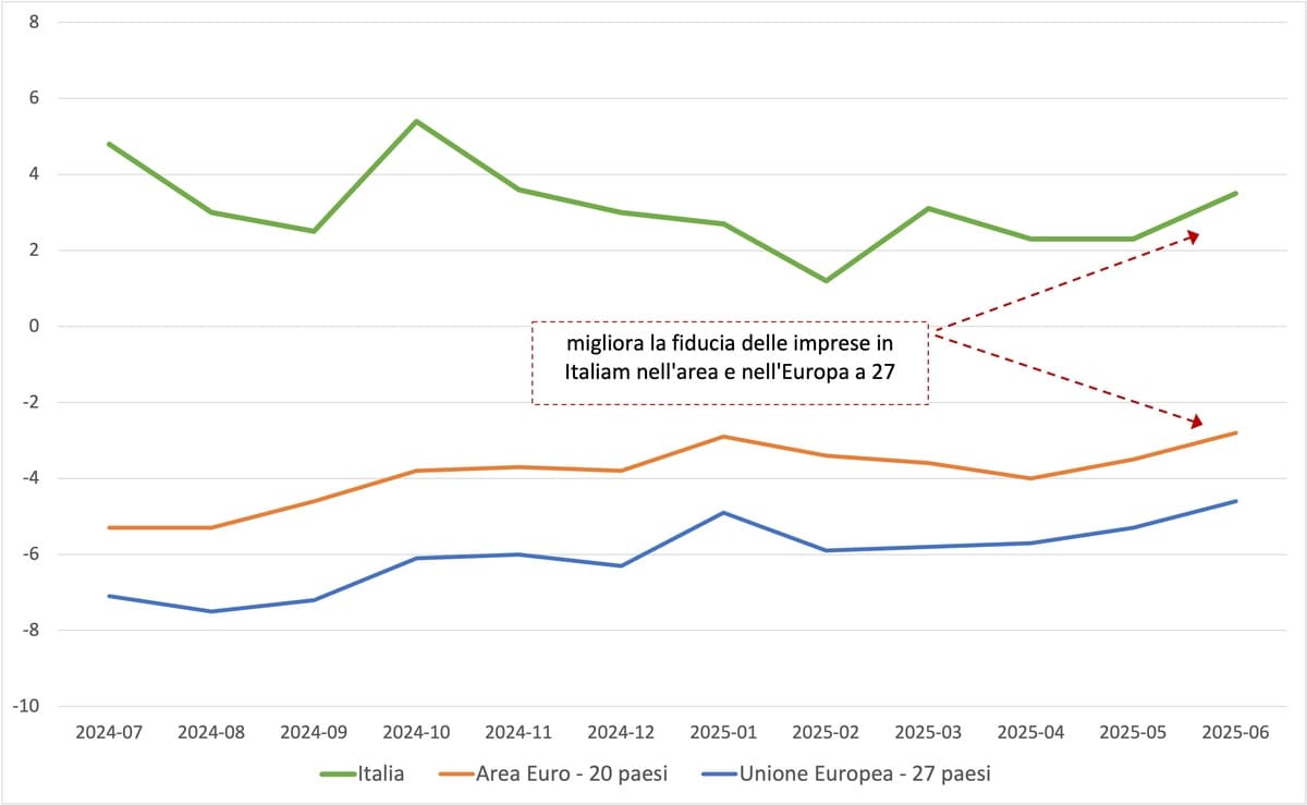 Indice condiviso anche a livello di area euro e di Europa a 27, che infatti vede la crescita della fiducia, portando i valori verso indicatori meno negativi, pari rispettivamente a -2,8 e -4,6 punti percentuali, quasi dimezzando quelli negativi relativi a un anno fa.
