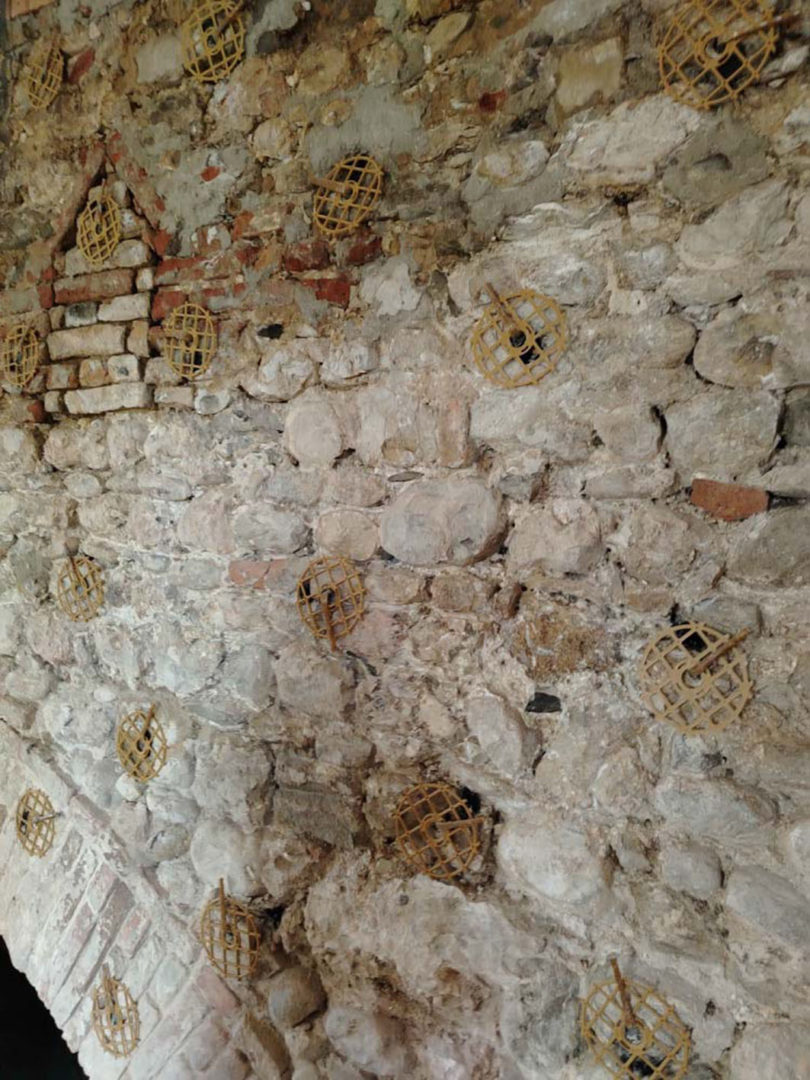 - ristilatura dei giunti, che consiste nel risanamento delle fughe danneggiate o erose della malta di allettamento. Dopo la risarcitura, si procede con la stilatura dei giunti e l’inserimento di connettori trasversali, sempre nella misura di circa 5 elementi per metro quadrato, per ristabilire la continuità meccanica tra i paramenti murari;