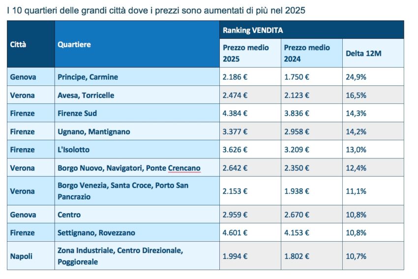 Per quanto riguarda le vendite, le città con i maggiori rialzi sono state Firenze e Verona, a pari merito (+7,8%), seguite da Roma (+6,8%), mentre per gli affitti troviamo sul podio Genova (+10,9%), Bari (+10,3%) e nuovamente Roma (+9,6%). Al contrario, le città a registrare gli aumenti meno significativi sono state Palermo (+2,6%), Venezia (+2,5%) e Milano (+2,1%) per le compravendite, mentre per le locazioni, oltre alla già citata flessione di Milano (-0,5%), sono Firenze (+3,5%) e Bologna (+1,8%) le città con le crescite più timide.