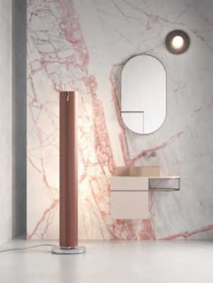 6. Una lampada da terra associata alla funzione di riscaldamento per Stilus di Caleido, disegnata da Giuseppe Bavuso. La forma incurvata aumenta la superficie e favorisce l’irraggiamento del calore. Personalizzabile con doppia finitura: all’interno argentata e riflettente, all’esterno in colori morbidi e avvolgenti.