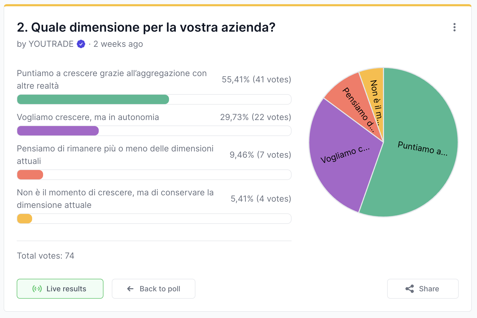 Non è un aspetto secondario: qual è la dimensione immaginata dagli imprenditori per la propria azienda e, soprattutto, da che cosa può essere determinata? Forse un po’ a sorpresa i partecipanti al sondaggio hanno risposto in netta maggioranza che prevedono un’aggregazione con altre aziende.