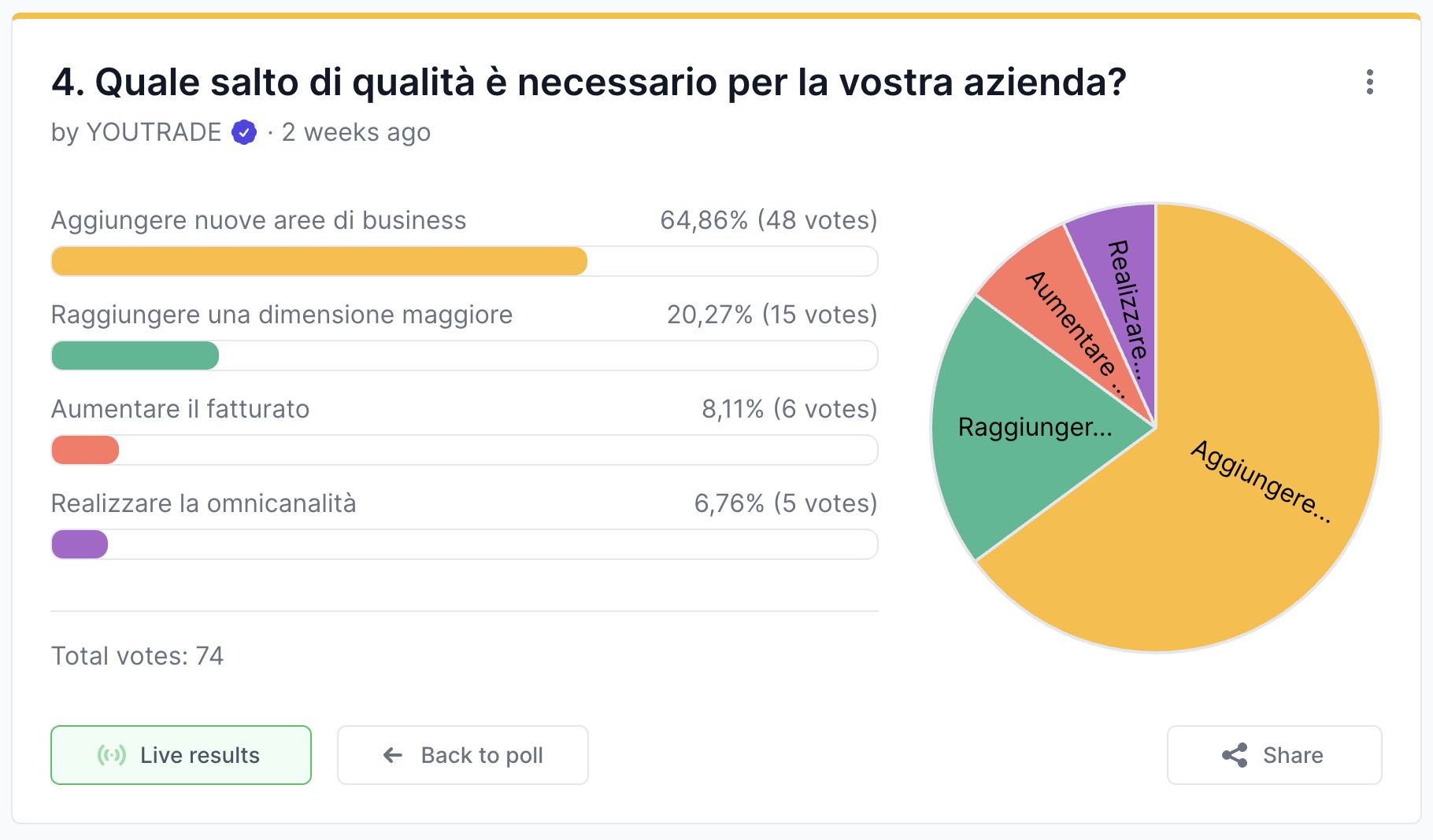 Un altro 20% ha invece indicato che la qualità è legata alla dimensione aziendale, in sintonia con il quesito precedente. Infine, qualcuno ha indicato l’aumento del fatturato e l’omnicanalità come il traguardo da raggiungere.